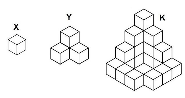 294. Sapendo che il cubo raffigurato in X ha un valore pari a 1 e che entrambe le figure Y e K sono composte da cubi in tutto e per tutto identici al cubo in X, quale risultato si ottiene dividendo Y per il terzo di K?