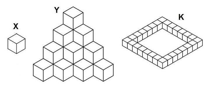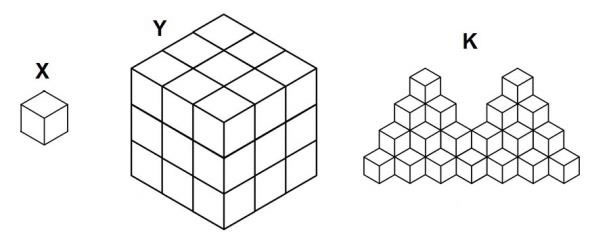 676. Sono date le seguenti informazioni: 1)la figura Y è composta da cubi aventi lo stesso valore del cubo contrassegnato dalla lettera X; 2)il cubo contrassegnato dalla lettera X ha valore pari a 2,5; 3)la figura K è composta da cubi aventi valore doppio rispetto a quello del cubo contrassegnato dalla lettera X. Si indichi quale risultato si ottiene sottraendo Y a K.