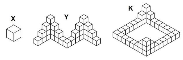 47. Se la scatola contrassegnata dalla lettera X contiene 7 kg di zucchero ed i blocchi Y e K sono costituiti da scatole identiche alla scatola X per forma e per contenuto, quanti kg di zucchero si ottengono se al quantitativo del blocco Y si aggiunge la metà del quantitativo del blocco K?