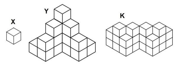 795. Sapendo che il cubo raffigurato in X ha un valore pari a 4 e che entrambe le figure Y e K sono composte da cubi in tutto e per tutto identici al cubo in X, quale risultato si ottiene dividendo Y per K?