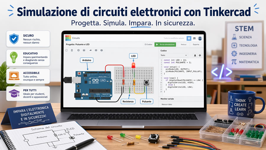 La possibilità di simulare il comportamento del circuito rende Tinkercad molto utile per la didattica. Gli studenti possono provare collegamenti, verificare errori, modificare componenti e osservare cosa succede senza rischiare di danneggiare materiali reali.