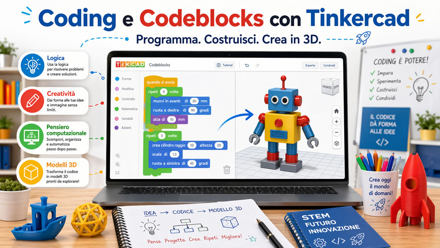 Tinkercad offre anche strumenti per avvicinarsi al coding. I Codeblocks permettono di creare forme 3D attraverso una programmazione visuale basata su blocchi. Invece di scrivere codice testuale, l’utente costruisce sequenze logiche trascinando blocchi che rappresentano comandi, ripetizioni, trasformazioni e parametri.