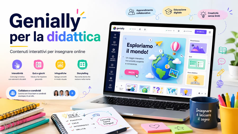 Con Genially è possibile creare presentazioni, infografiche, quiz, giochi didattici, immagini interattive, mappe concettuali, escape room, flashcard, timeline e percorsi di apprendimento digitali. La piattaforma mette a disposizione modelli già pronti, elementi interattivi, animazioni e strumenti collaborativi, rendendo più semplice trasformare una lezione tradizionale in un’esperienza più dinamica e partecipativa.