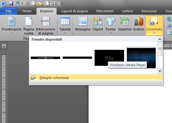 La procedura appena descritta non consente, di solito, di catturare una immagine dal riproduttore video in modalità PAUSA. Pertanto, per inserire un fermo immagine da Windows Media Player sarà necessario utilizzare il comando RITAGLIO SCHERMATA, presente in fondo al menu nel menu del pulsante SCHERMATA.