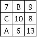 40. Quali numeri interi e positivi devono essere inseriti rispettivamente al posto della A, B e C affinché la somma dei numeri presente in ogni riga, in ogni colonna e in entrambe le diagonali dia sempre 30?