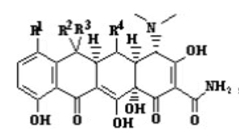 615. Quale tipo di interazione determina la riduzione dei livelli ematici di tetracicline, aventi la struttura generale indicata, in seguito a contemporanea assunzione dell’antibiotico e di alimenti ricchi di calcio?
