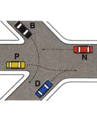 Secondo le norme di precedenza nell'incrocio rappresentato in figura i veicoli passano nel seguente ordine: P, B, N, D